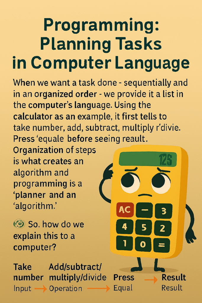उदाहरण के तौर पर हम कैलकुलेटर को देख सकते हैं। उसमें पहले से तय होता है कि वह सबसे पहले हमसे नंबर लेगा। इसके बाद यह निर्धारित होता है कि हमें उससे क्या करवाना है—जोड़, घटाव, गुणा या भाग। हम जैसा निर्देश देंगे, कैलकुलेटर वैसा ही परिणाम देगा। लेकिन यह भी तय है कि जब तक हम बराबर का चिन्ह नहीं दबाएंगे, तब तक वह हमें उत्तर नहीं दिखाएगा। इसका मतलब है कि हर कार्य का एक क्रम होता है, और कंप्यूटर उसी क्रम के अनुसार काम करता है।