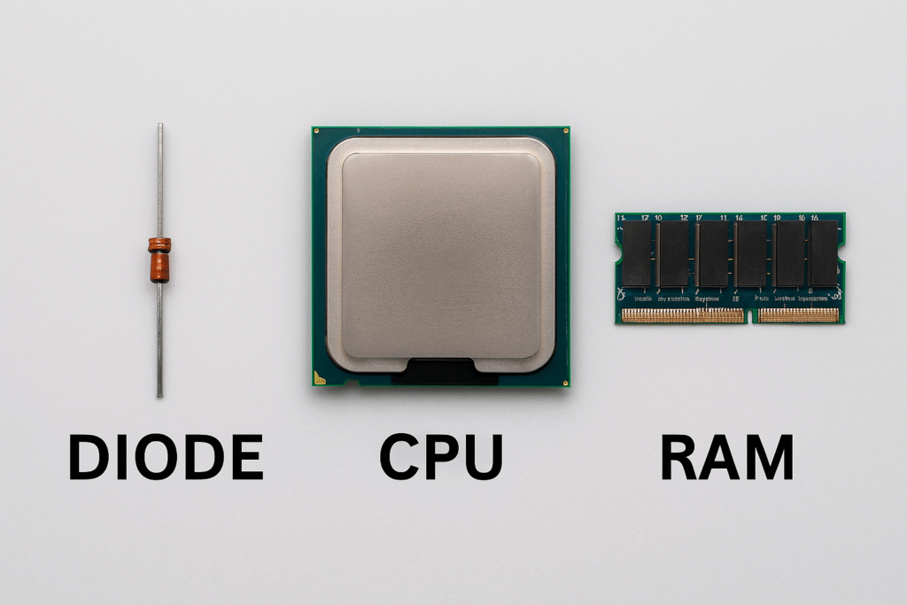 - CPU (सी.पी.यू.): यह Capacitors से निर्मित होता है, जो चार्ज के रूप में डेटा को नियंत्रित करने का कार्य करता है। यह कंप्यूटर का मस्तिष्क कहलाता है, जो सभी निर्देशों को प्रोसेस करता है।